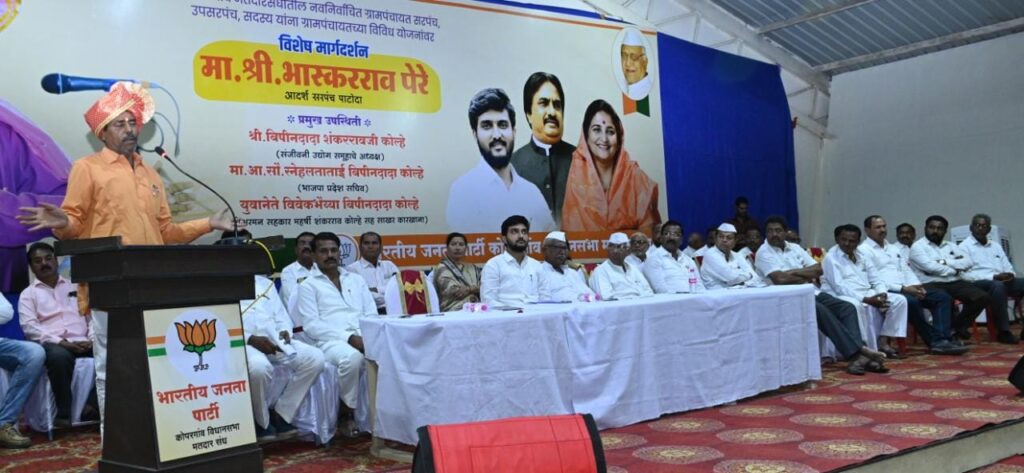 कोपरगाव विधानसभा मतदारसंघातील भाजपच्या नवनिर्वाचित सरपंच, उपसरपंच आणि ग्रामपंचायत सदस्यांचा व निवडणुकीस सामोरे गेलेल्या उमेदवारांचा कोपरगाव तालुका भारतीय जनता पक्षाच्या वतीने आदर्श गाव पाटोदाचे माजी सरपंच भास्करराव पेरे-पाटील व सहकारमहर्षी शंकरराव कोल्हे सहकारी साखर कारखान्याचे अध्यक्ष, युवा नेते विवेकभैय्या कोल्हे यांच्या हस्ते सत्कार करण्यात आला. त्यावेळी पेरे-पाटील बोलत होते. अध्यक्षस्थानी सहकारमहर्षी शंकरराव कोल्हे सहकारी साखर कारखान्याचे ज्येष्ठ संचालक त्र्यंबकराव सरोदे होते. व्यासपीठावर ज्येष्ठ नेते दत्तू नाना कोल्हे, सहकारमहर्षी शंकरराव कोल्हे साखर कारखान्याचे उपाध्यक्ष रमेश घोडेराव, संचालक बाळासाहेब वक्ते, मनेष गाडे, विलासराव वाबळे, निवृत्ती बनकर, ज्ञानेश्वर परजणे, बापूराव बारहाते, ज्ञानेश्वर होन, निलेश देवकर, बाळासाहेब पानगव्हाणे, अरुणकाका येवले, रमेश आभाळे, विलासराव माळी, सतीश आव्हाड, कैलास माळी, उषा संजय औताडे, मधुकरराव वक्ते, मोहनराव वाबळे, केशवराव भवर, नारायण अग्रवाल, बापूसाहेब सुराळकर, विलासराव आव्हाड, सतीश केकाण, भाजप युवा मोर्चाचे तालुकाध्यक्ष विक्रम पाचोरे, माजी नगराध्यक्ष संजय सातभाई, माजी उपनगराध्यक्ष योगेश बागुल, माजी नगरसेवक अतुल काले, जनार्दन कदम, अशोक लकारे, दीपक जपे, भाजप महिला मोर्चाच्या शहराध्यक्षा वैशालीताई आढाव, माजी नगरसेविका विद्याताई सोनवणे, शिल्पाताई रोहमारे आदींसह संजीवनी उद्योग समूहाशी संलग्न विविध संस्थांचे तसेच भाजप, भाजयुमो, ग्रा. पं. चे आजी-माजी पदाधिकारी उपस्थित होते. प्रारंभी भास्करराव पेरे-पाटील व विवेकभैय्या कोल्हे यांच्या हस्ते माजी मंत्री स्व. शंकरराव कोल्हे यांच्या प्रतिमेचे पूजन करण्यात आले. प्रास्ताविक भाजप तालुकाध्यक्ष साहेबराव रोहोम यांनी तर सूत्रसंचालन माजी पं. स. सभापती शिवाजीराव वक्ते व संजीवनी सहकारी पतसंस्थेचे अध्यक्ष प्रदीप नवले यांनी केले.