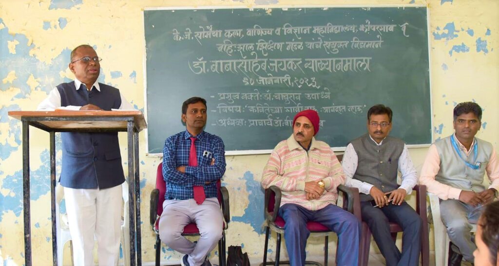 बहि:शाल शिक्षण मंडळ-सावित्रीबाई फुले पुणे विद्यापीठ पुणे व के. जे. सोमैया महाविद्यालय यांचे संयुक्त विद्यमाने दि. ९ व १० जानेवारी रोजी डॉ. बाबासाहेब जयकर व यशवंतराव चव्हाण व्याख्यानमालेचे यशस्वी आयोजन करण्यात आले. डॉ. बाबासाहेब जयकर व्याख्यानमालेचे वक्ते डॉ. बाबुराव उपाध्ये ‘कवितेच्या गावी जाऊ : आनंदाने न्हाऊ’ या विषयावर बोलताना म्हणाले की “कविता ही आनंदी जीवन जगण्याचे सशक्त माध्यम आहे. कवितेद्वारे समाज-मनातील भाव-भावना तसेच कष्टकऱ्यांचा आवाज, सामाजिक जाणीवा आदींना व्यासपीठ उपलब्ध करून दिला जातो. मी स्वतः जे जीवन जगलो तेच माझ्या कवितेद्वारे शब्दबद्ध करीत गेलो. त्यामुळे माझ्या कवितेत वाचकांना दुःख, व्यथा व कष्टाचे प्रतिबिंब पडलेले अधिक जाणवते. माझी कविता मनोरंजन कमी आणि सर्वसामान्यांच्या दुःखावर फुंकर घालण्याचा प्रयत्न अधिक करते.” यावेळी डॉ. उपाध्ये यांनी स्वतःच्या निवडक कवितांबरोबरच ग. दि. माडगूळकर, विंदा करंदीकर, मंगेश पाडगावकर, राष्ट्रसंत गाडगेबाबा, राष्ट्रसंत तुकडोजी महाराज यांच्याही कविता सादर करून विद्यार्थ्यांना मंत्रमुग्ध केले. तसेच सध्याच्या सोशल मीडियाच्या काळात विद्यार्थ्यांनी विविध काव्यग्रंथ आणि प्रासंगिक साहित्य वाचत राहून वाचन संस्कृती टिकवली पाहिजे. त्यातून आपल्याला समृद्ध जीवन जगण्याचा मार्ग सापडेल असेही सांगितले.
