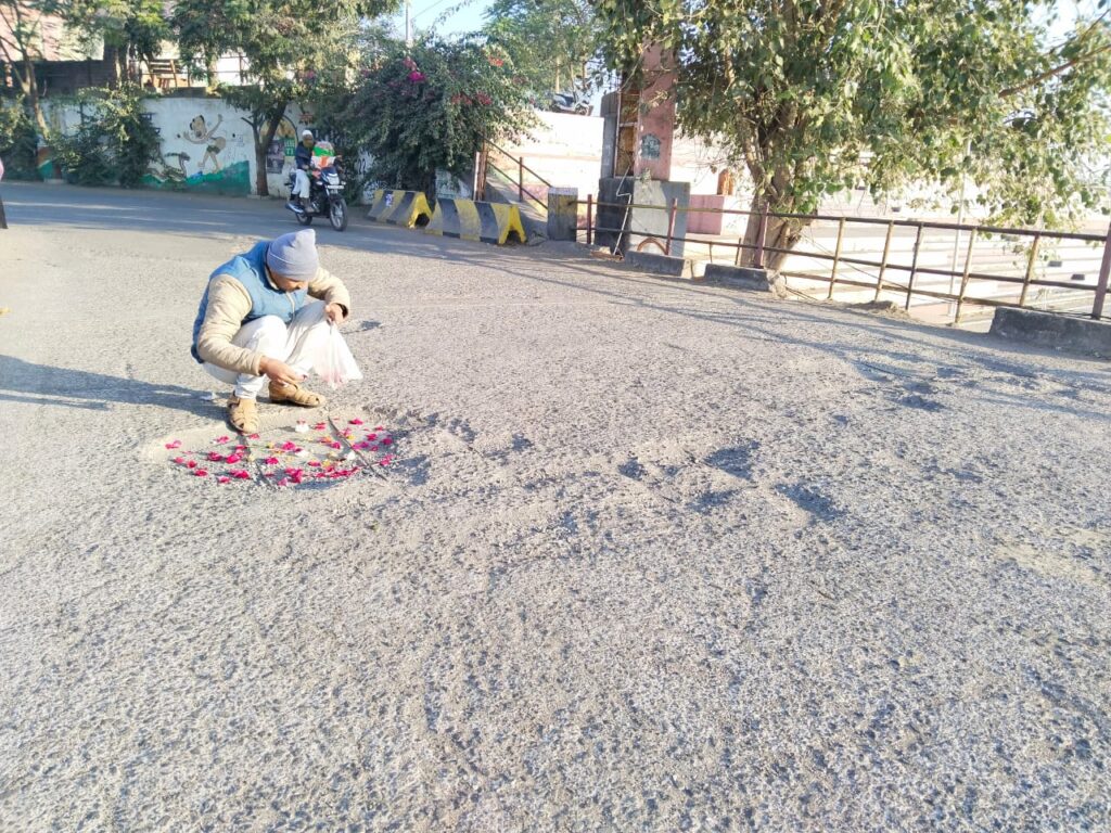 त्यामुळे पालिका प्रशासनाने लवकरात लवकर या पुलाची डागडुजी करावी ही मागणी करत पालिका प्रशासनाचे लक्ष वेधून घेण्यासाठी पुलावर पडलेल्या खड्यात गुलाबाच्या फुलाच्या पाकळ्या टाकत अनोख्या पध्दतीने गांधीगिरी आंदोलन केले.