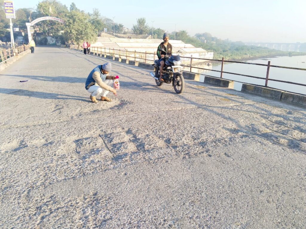 सविस्तर वृत्त असे की, कोपरगाव शहरातून वाहणाऱ्या पवित्र अशा गोदावरी नदी व शहर व बेट भागाला जोडला जाणारा महत्वाचा दुवा असलेल्या राष्ट्रसंत जनार्धन स्वामी ( मौनगिरी) सेतू वर मोठ्या प्रमाणात लहान मोठे खड्डे पडले असून या पुलावरील पडलेल्या खड्यात गोदामाई प्रतिष्ठानचे अध्यक्ष आदिनाथ ढाकणे यांनी गुलाबाच्या फुलाच्या पाकळ्या टाकत पालिका प्रशासनाचे लक्ष वेधण्यासाठी गांधीगिरी पद्धतीने आंदोलन करत या पुलाची लवकरात लवकर पालिका प्रशासनाने डागडुजी करून द्यावी अशी मागणी करत शहरातील सर्व पक्षीय लोकांनी एकत्रित येवून हा गोदावरी नदी वरील लहान पूल वाचविला पाहिजे त्यासाठी प्रशासनाला भेटून या पुलाची डागडुजी कशी होईल यासाठी प्रयत्न केले पाहिजे असे आवाहन ढाकणे यांनी मंगळवार दि १० जानेवारी २०२३ रोजी गांधीगिरी आंदोलना प्रसंगी केले आहे.