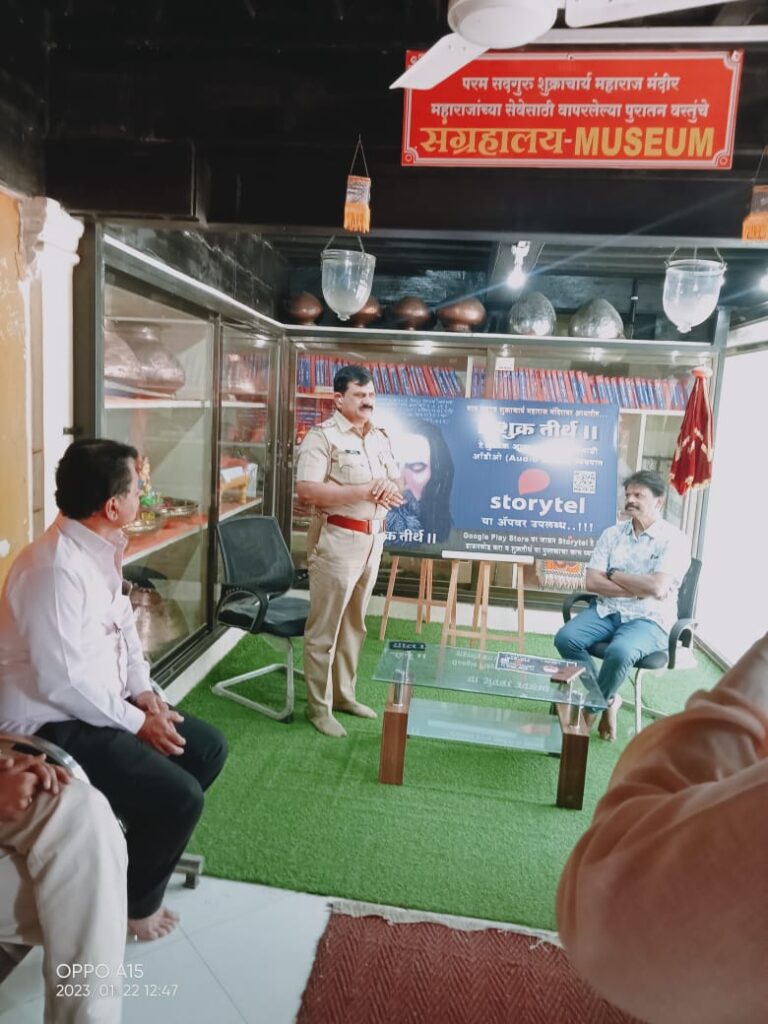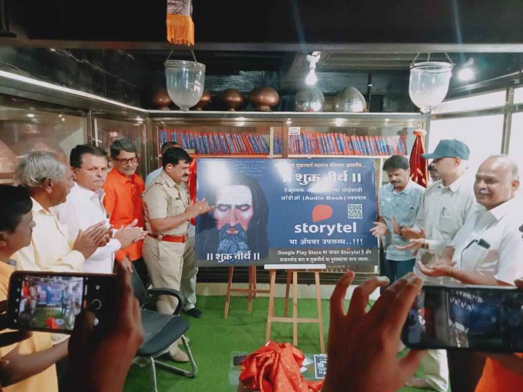 या उपक्रमाचे अनेक भाविक साक्षीदार होते . गुरू शुक्राचार्य महाराज मंदिर व शुक्राचार्य महाराज यांची माहिती व महतीच सांगणारे देवस्थान अध्यक्ष श्री बाळासाहेब आव्हाड लिखित ” शुक्र तीर्थ ” या पुस्तकाचे ऑडियो बुक ( Audio Book ) चे लॉन्चिंग कोपरगांव चे लोकप्रिय P I श्री देसले साहेब यांच्या शुभ हस्ते करण्यात आले . ” शुक्र तीर्थ ” हे पुस्तक अत्यंत लोकप्रिय असलेले आणि एक कोटी पेक्षा जास्त लोकांनी subscribe केलेल्या प्रसिद्ध अश्या ” Storytel ” या ॲप वर आता ऑडियो ( Audio ) मध्ये उपलब्ध झाले आहे . त्यास प्रसिद्ध कलाकार श्री सचिन सुरेश यांनी आपला सुंदर आणि भारदस्त आवाज दिलेला आहे . या प्रसंगी देवस्थान ट्रस्ट चे वतीने श्री देसले साहेब यांचा यथोचित सत्कार करण्यात आला. सुरवातीस श्री भागचंद रुईकर यांनी प्रास्ताविक केले , श्री बाळासाहेब आव्हाड यांनी Storytel aap व पुस्तकाविषयी माहिती सांगितली या नंतर उद्घाटक श्री देसले साहेब यांनी अतिशय सुंदर असे मार्गदर्शन केले , श्री राजेन्द्र ( मुन्ना ) आव्हाड यांनी आभार प्रदर्शन केले .
