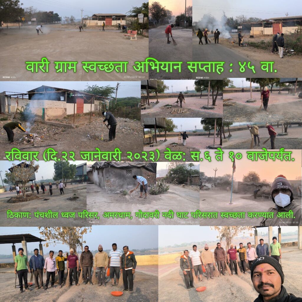 या अभियानात वारी येथील बाजारतळ परिसरातील पंचशील ध्वज परिसर, अमरधाम व गोदावरी नदी घाट परिसरात मोठ्या प्रमाणात स्वच्छता करण्यात आली. तसेच संकलित केलेला कचरा, प्लास्टिक पिशव्या, काटेरी झुडपा तोडून पेटवून देण्यात आल्या. या अभियानात सामाजिक कार्यकर्ते मधुकरराव टेके, जय बाबाजी भक्त परिवाराचे भाऊसाहेब टेके, सेवानिवृत्त अधिकारी रावसाहेब जगताप साहेब,पंडित लकारे, सेतू कार्यालयाचे संचालक रवींद्र टेके, ‘लोकमत’चे उपसंपादक रोहित टेके, गोदावरी बायोरीफायनरीजचे अधिकारी निलेश संत साहेब, विलास गाडेकर, वारी ग्रामपंचायत कर्मचारी रावसाहेब वाघ, विलास जगधने, मनोज जगधने, यांनी स्वच्छतेच्या या अभियानात आपले श्रमरुपी योगदान दिले.