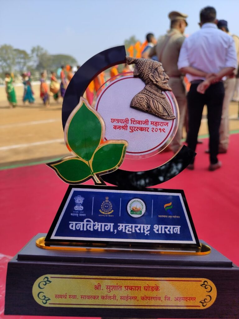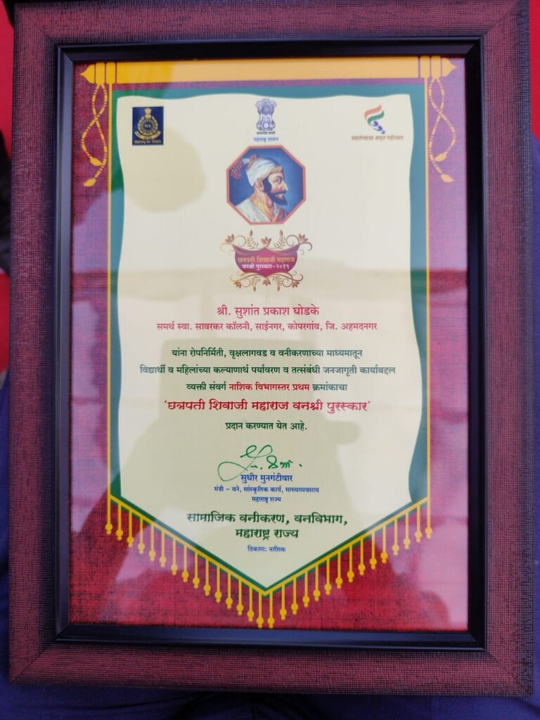 (शिर्डी):- महाराष्ट्र शासनाच्या वन विभागाच्या वतीने देण्यात येणारा “छत्रपती शिवाजी महाराज वनश्री पुरस्कार – २०१९” कोपरगाव येथील सूर्यतेज संस्थापक आणि वृक्ष पर्यावरण प्रेमी, भारत सरकारचे स्वच्छतादूत सुशांत घोडके यांना पालकमंत्री दादाजी भुसे यांचे हस्ते वितरण करण्यात आला आहे. नाशिक येथील पोलिस परेड मैदानावर जिल्ह्याचे मुख्य ध्वजारोहण नंतर या पुरस्काराचे वितरण करण्यात आले.