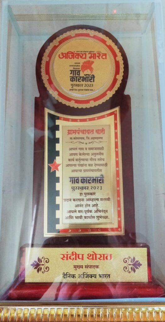 कोपरगाव प्रतिनिधी:- तालुक्यातील वारी येथील प्रथम लोकनियुक्त सरपंच सतिषभाऊ कानडे यांना वारी गावाकरिता दिलेल्या बहुमोल योगदानाबद्दल अजिंक्य भारत दैनिक वृत्तपत्र यांचे वतीने देण्यात येणारा जिल्ह्यातील कर्तृत्ववान सरपंच/उपसरपंच यांच्या पाठीवर शाबासकी देणारा मानाचा “गाव कारभारी पुरस्कार २०२३” नुकताच अहमदनगर येथे माजी मंत्री प्रा राम शिंदे यांचे हस्ते व शिवसेना अहमदनगर जिल्हा प्रमुख प्रा शशिकांतजी गाडे यांचे उपस्थितीत सन्मानपूर्वक प्रदान करण्यात आला यावेळी जिल्हाभरातील अनेक सरपंच उपसरपंच व पदाधिकारी उपस्थित होते