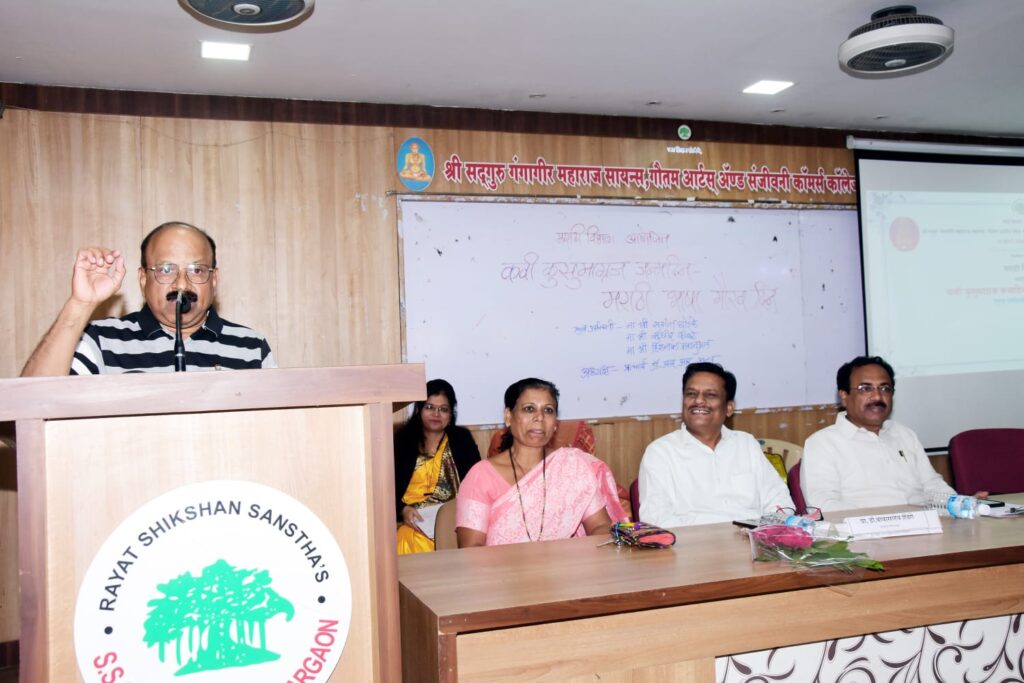 कार्यक्रमाचे प्रास्ताविक प्रा.डॉ.उज्ज्वला भोर यांनी केले सदर प्रास्ताविकातून त्यांनी कवी कुसुमाग्रज जन्मदिन व जागतिक मराठी भाषा गौरवदिन साजरा करण्यामागील भूमिका स्पष्ट केली. तर सूत्रसंचालन प्रा. डॉ. सीमा चव्हाण यांनी केले.उपस्थितांचे आभार प्रा.डॉ.बाबासाहेब शेंडगे यांनी मानले.या कार्यक्रमासाठी कला शाखेचे उपप्राचार्य प्रा.डॉ.सुभाष रणधीर, वाणिज्य शाखेचे उपप्राचार्य प्रा. डॉ.अर्जुन भागवत, हिंदी विभाग प्रमुख प्रा.डॉ.रंजना वर्दे, प्रा. सुनील काकडे,.प्रा.प्रदीप जगझाप ,प्रा.रावसाहेब दहे,प्रा.अक्षय आहेर, यांसह कार्यालयीन अधीक्षक,शिक्षक, शिक्षकेतर कर्मचारी व विद्यार्थी मोठ्या संख्येने हजर होते.