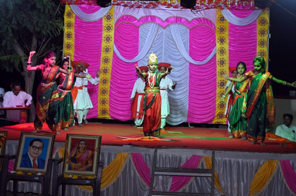 फोटोओळी-१) मोठेबाबावाडी जिल्हा परिषद प्राथमिक शाळेत स्नेहसमेलंनात कलागुण सादर करतांना विद्यार्थी.