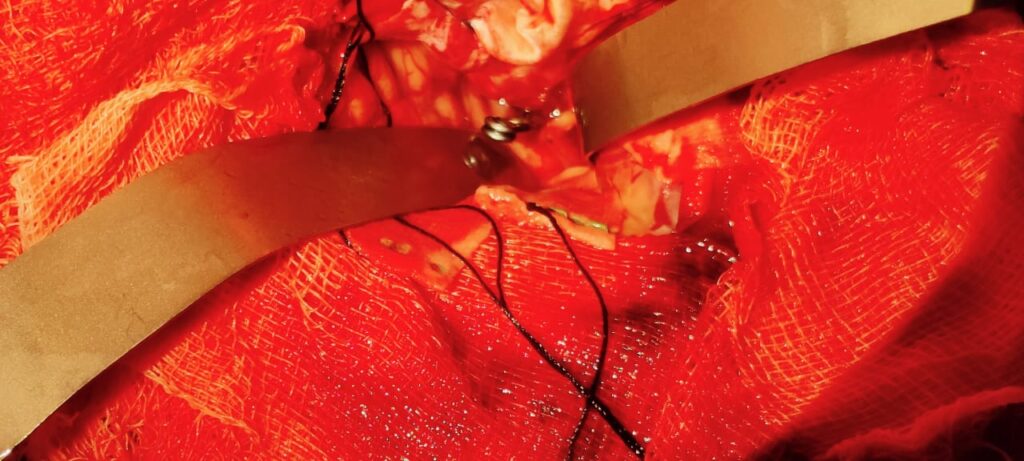 ( २ ) मेंदूतील रक्तवाहिनी फुटून तयार झालेला फुग्यावर केलेली शस्त्रक्रिया दिसत आहे.