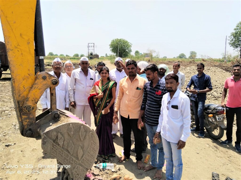 फोटो ओळ – शहापूर गावातील ओसपांढरी परिसरातील रस्त्याच्या खडीकरणाचा शुभारंभ करतांना लोकनियुक्त सरपंच श्रीमती योगिता घारे (डांगे) समवेत मान्यवर.