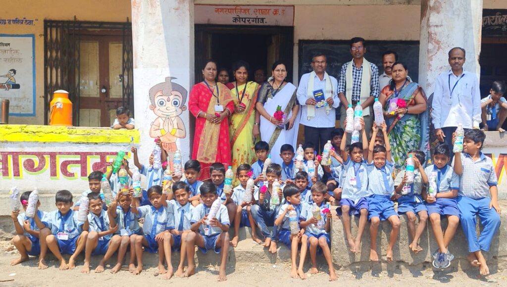 कोपरगांव नगरपरिषदेच्या शिक्षण मंडळ शाळा क्र.६ येथील मुख्याध्यापिका कल्पना निंबाळकर यांचे मार्गदर्शनाखाली उपशिक्षिका सुनिता इंगळे यांचे संकल्पनेतून शालेय विद्यार्थ्यांना घर व परिसरातील छोट्या प्लास्टिक कचरा प्लास्टिक बाटलीत एकत्र करून संकलन अभियान सुरु केले आहे. सुमारे ५० बाटली कचरा संकलन केले. या कृतीची दखल स्वच्छतादूत वनश्री सुशांत घोडके यांनी घेतली. त्यांनी सूर्यतेज संस्थेच्या वतीने निवासी नायब तहसिलदार पोपटराव पवार यांचे शुभहस्ते मुख्याध्यापिका कल्पना निंबाळकर, संकल्पक उपशिक्षिका सुनिता इंगळे,सविता साळुंके,आरती कोरडकर,शिक्षक – अरुण पगारे यांचा सन्मानचिन्ह व पुष्पगुच्छ तसेच स्वच्छतामित्र विद्यार्थांना पेन भेट देऊन सन्मान केला. याप्रसंगी सामाजिक कार्यकर्ते संदिप ठोके, शालेय व्यवस्थापन समिती अध्यक्षा अर्चना वाहुळकर शालेय विद्यार्थी उपस्थित होते.