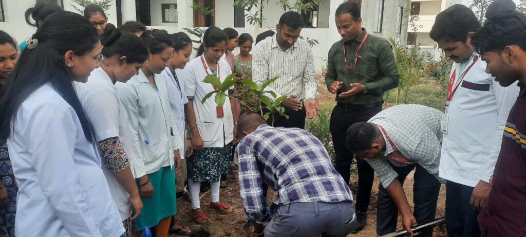कोपरगाव/कोकमठाण येथे नर्सिंग कॉलेजमध्ये जागतिक आरोग्य दिनानिमित्त वृक्ष रोपण करतांना प्राचार्य इरशाद अली उपप्राचार्य जील्स सुरेश व सोबत सर्व विद्यार्थी दिसत आहे.
