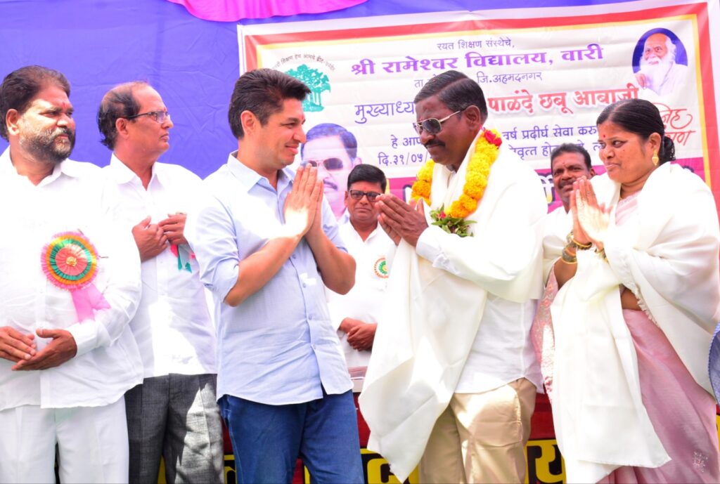 यावेळी प्रमुखपाहुणे म्हणून महांनंदाचे अध्यक्ष राजेश परजणे, आमदार सत्यजित तांबे, रयत शिक्षण संस्थेचे उपविभागीय अधिकारी काकासाहेब वाळुंजकर, गटशिक्षणाधिकारी शबाना शेख, गोदावरी बायोरीफायानरिजचे संचालक सुहास गोडगे, कोपरगाव बाजार समितीचे माजी सभापती मधुकर टेके, सुरेश जाधव, माजी सरपंच सतीश कानडे, बद्रीनाथ जाधव, कामगार अधिकारी संजय कराळे, माजी पंचायत समिती सदस्य अशोक कानडे, सुरेश बोळीज, विलास वाकचौरे, सर्जेराव मते, रमेश शिंदे, रामदास सोनवणे, भाऊसाहेब टेके, अशोक बोर्डे, अँड. शरद जोशी यांच्यासह मुख्याध्यापक छबुराव पाळंदे, सुनीता पाळंदे, अमोल पाळंदे, सोनाली बागुल, कविता खरात व्यासपिठावर उपस्थित होते. यावेळी इयत्ता नववीच्या विद्यार्थिनी स्वागत गीताने कार्यक्रमाची सुरुवात केली. उपस्थित मान्यवरांच्या हस्ते मुख्याध्यापक छबुराव पाळंदे यांचा सपत्नीक शाल, श्रीफळ, पुष्पगुच्छ व मानपत्र देऊन सन्मान करण्यात आला. यावेळी मुख्याध्यापक पाळंदे यांनी विद्यालयातील गरीब विद्यार्थी फंडासाठी १५ हजारांची आर्थिक मदत देऊ केली. यावेळी आपल्या ३४ वर्षाच्या शैक्षणिक कार्याचा मागोवा घेताना मुख्याध्यापक पाळंदे हे अत्यंत भावूक झाले होते. याप्रसंगी सुरेश बोळीज, रमेश शिंदे, काकासाहेब वाळूजकर, शबाना शेख, कैलास शेळके व सदिक्षा वाघ या विधार्थीनीने मनोगत व्यक्त केले. तसेच एम. के. टेके यांचे अध्यक्षीय भाषण झाले.
