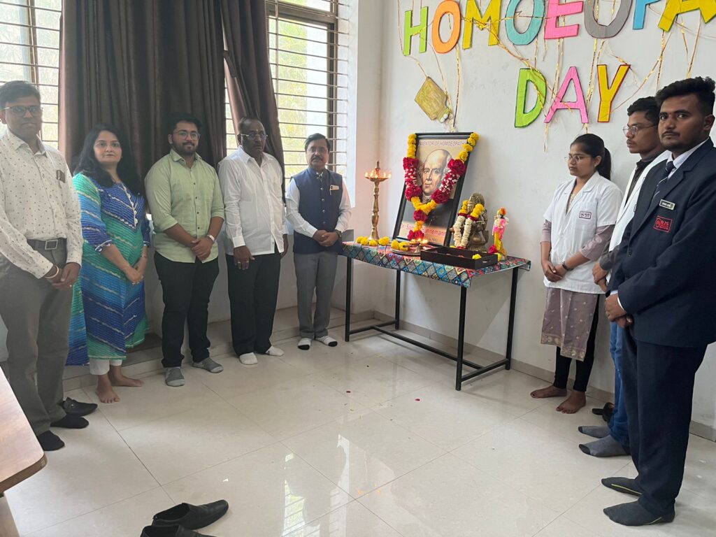 आर जे एस होमिपॅथीक कॉलेज मध्ये जागतिक होमिपॅथीक दिन साजरा करतांना प्रमुख पाहुणे सर्व विद्यार्थी व शिक्षक कर्मचारी उपस्थित दिसत आहे.