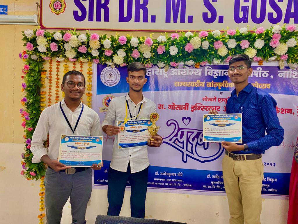 मोठ्या उत्साहाने सहभाग नोंदवला आहे. विद्यापीठाने आयोजित केलेल्या ललित कला ही स्पर्धा नाशिकच्या गोखले एज्युकेशन सोसायटीमध्ये आयोजित केली होती. ललित कलामधील चिकणमाती कला या स्पर्धेत राष्ट्रसंत जनार्दन स्वामी नर्सिंग कॉलेजच्या रोहित गोविंद दळवी या विद्यार्थ्याने द्वितीय क्रमांक मिळवत विद्यालयाचे नाव रोशन केले.रोहित गोविंद दळवी याला सन्मानपत्र, ट्रॉफी, व मेडल देऊन गौरविण्यात आले, त्यावेळी मंचावर महाराष्ट्र विज्ञान विदयापीठाचे कुलगुरू डॉ.माधुरी कानिटकर पूर्व कुलगुरू डॉ मिलिंद निकम कुलसचिव डॉ.राजेंद्र बंगाळ,विद्यार्थी कल्याण संचालक मनोजकुमार मोरे,गोखले नर्सिंग कॉलेजच्या प्राचार्य डॉ.ज्योती ठाकुर इत्यादी उपस्थित होते. स्पर्धेमध्ये राष्ट्रसंत जनार्दन स्वामी नर्सिंग कॉलेजचे सौरभ मुंगसे चित्रकला स्पर्धा, रोहित पगारे फोटोग्रॉफी (स्थल छायाचित्रकारी) या विदयार्थ्यांनी सुद्धा सहभाग नोंदवला. या विद्यार्थ्यांनाही प्रशस्तिपत्रक देऊन गौरविण्यात आले. विद्यार्थ्यांना आरजेएस संस्थेचे चेअरमन चांगदेव कातकडे संस्थेचे सदस्य विजय कडु, संस्थेचे सेक्रेटरी प्रसाद कातकडे संस्थेचे सदस्य दिपक कोटमे महाविद्यालयाचे प्राचार्य इरशाद अली यांचे मोलाचे सहकार्य लाभले.