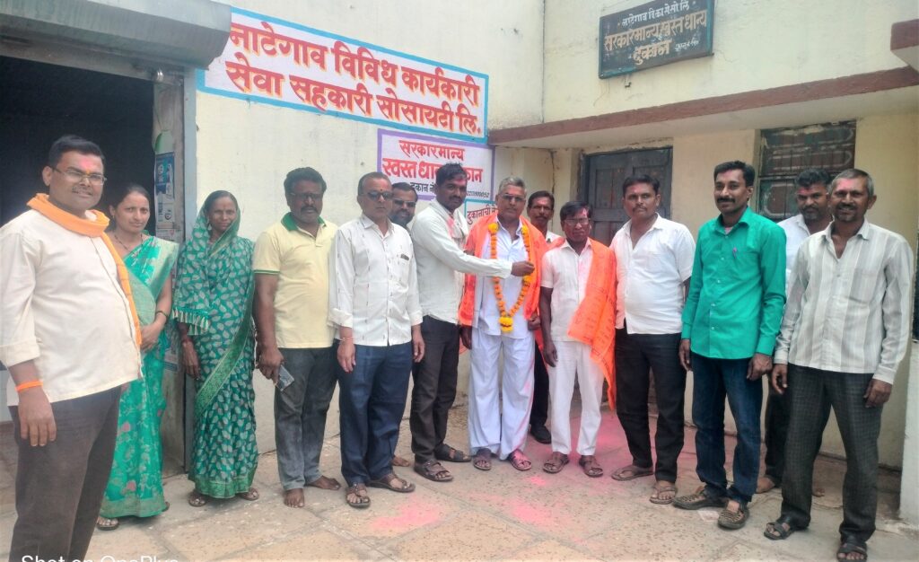फोटो ओळ:- नाटेगाव सेवा सोसायटीच्या नूतन चेअरमन, व्हा. चेअरमन यांचे अभिनंदन करतांना सदस्य व कार्यकर्ते.