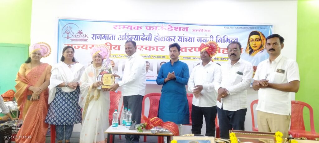 राजामाता अहिल्यादेवी होळकर यांच्या जयंती निमित्ताने सम्यक फाउंडेशन च्या वतीने विविध क्षेत्रात उल्लेखनीय कार्य करणाऱ्या व्यक्तींना राज्यस्तरीय पुरस्कार देऊन सन्मानित करण्यात आले. या कार्यक्रमाच्या अध्यक्षस्थानी राज्य पतसंस्था फेडरेशन चे अध्यक्ष काकासाहेब कोयटे तर प्रमुख पाहुणे म्हणून राज्य महिला आयोगाच्या सदस्या उत्कर्षाताई रुपवते, महिला काँग्रेस आय अ. जा. विभागाच्या जिल्हाध्यक्षा सविता विधाते शिक्षक बँकेचे संचालक शशिकांत जेजुरकर, विलास गवळी, योगेश वाघमारे, वीज तांत्रिक पतसंस्थेचे संचालक सिताराम खंडागळे,फाउंडेशन चे अध्यक्ष महेंद्र विधाते,कविता धिवरे आदिसह मान्यवर उपस्थित होते. कार्यक्रमाची सुरवात थोर महापुरुषांच्या प्रतिमा पूजन व दीप प्रज्वललाने करण्यात आली.याप्रसंगी विविध क्षेत्रात कार्य करणाऱ्यानां क्रांतीसुर्य महात्मा ज्योतिबा फुले आदर्श शिक्षक पुरस्कार संजय उत्तम बोरसे , रमेश सयाजी टिक्कल , आशिक लतीफ शेख यांना क्रांतीज्योती सावित्रीबाई फुले आदर्श शिक्षिका पुरस्कार