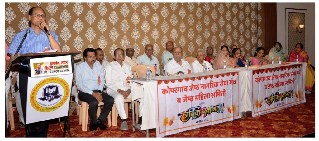 कोपरगाव प्रतिनिधी:- येथील संस्थापक अध्यक्ष कै भागचंद भाऊ ठोळे यांनी स्थापन केलेल्या जेष्ठ नागरिक सेवा मंचच्या तेविसाव्या वर्धापनदिनानिमित्त डॉ दत्तात्रय मुळे यांनी मनोगत व्यक्त केले, मठाधिपती महंत श्री रामगिरीजी महाराज यांनी आशिर्वाद दिले त्या प्रसंगी उद्योजक कैलास ठोळे, मंचचे उपाध्यक्ष दत्तोपंत कंगले, उत्तम भाई शहा, डॉ विलास आचार्य, सोहनलाल भंडारी ,ह भ प थोरे महाराज, पतसंस्था फेडरेशनचे काकासाहेब कोयटे, महानुभाव आश्रमाचे डॉ यशराज महाराज आदी मान्यवर उपस्थित होते.