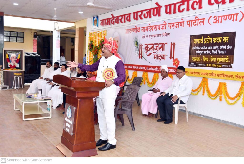गोदावरी खोरे नामदेवरावजी परजणे पाटील तालुका सहकारी दूध संघाचे संस्थापक दिवंगत नेते नामदेवराव परजणे पाटील (आण्णा) यांच्या १९ व्या पुण्यस्मरण सोहळ्यानिमित्त संवत्सर येथे आयोजित व्याख्यानातून ‘ प्रेरणा युवकांसाठी..’ या विषयावर प्राचार्य कदम बोलत होते. शिक्षणतज्ज्ञ अनिलराव गुंजाळ यांच्या अध्यक्षतेखाली झालेल्या या कार्यक्रमासाठी जिल्हा परिषदेच्या माजी अध्यक्षा सौ. शालिनीताई विखे पाटील, विश्वात्मक जंगली महाराज आश्रमाचे संत परमानंद महाराज, संत विवेकानंद महाराज, संत चंद्रानंद महाराज, संत राजानंद महाराज, संत प्रेमानंद महाराज तसेच महाराष्ट्र राज्य सहकारी दूध महासंघाचे संचालक विलासबापू बडगे, महंत दामोदरबावा महानुभाव, नगराध्यक्ष विजयराव वहाडणे, जिल्हा परिषदेचे माजी सदस्य शरदराव नवले, सौ. धनश्री विखे पाटील यांची उपस्थिती होती. प्रारंभी स्व. नामदेवराव परजणे आण्णा यांच्या प्रतिमेचे पूजन करण्यात आले. तर महाराष्ट्र राज्य सहकारी दूध महासंघाचे अध्यक्ष राजेश परजणे पाटील यांनी स्वागत केले. संवत्सर येथील नामदेवराव परजणे पाटील महाविद्यालयाच्या ‘ गोदानाम संवत्सरे ‘ आणि कोपरगाव येथील महिला महाविद्यालयालयाच्या ‘ कृपासिंधू ‘ या वार्षिक नियतकालिकांचे प्रकाशन पाहुण्यांच्या हस्ते करण्यात आले. तसेच गुणवंत विद्यार्थी – विद्यार्थीनींना शिष्यवृत्तीचे धनादेश तर गरीब विद्यार्थ्यांना सहाणे बंधू यांच्यावतीने शालेय गणवेश वितरीत करण्यात आले.