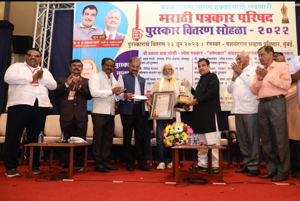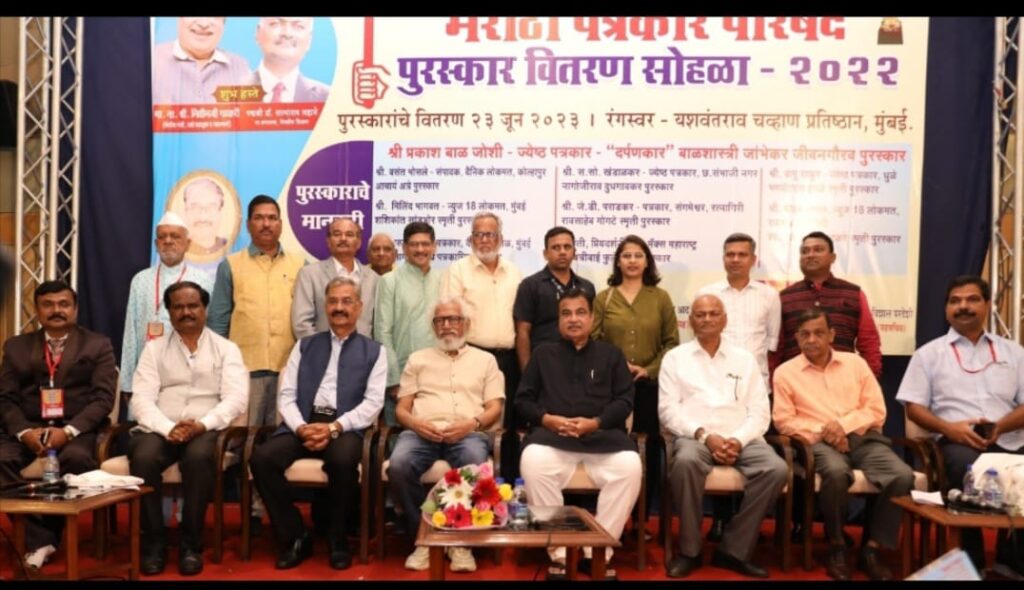 या साठी परीषदेचे विश्वस्त आमचे मार्गदर्शक मा.श्री किरण नाईक, मुंबईचे अध्यक्ष राजाभाऊ आदाटे , विभागीय सचिव दीपकजी कैतके, विनायकजी सानप, संजयजी मिस्कीन, दीपकजी पवार, पांडुरंगजी म्हस्के या टीमवर्क मुळे पत्रकार सन्मान सोहळा यशस्वी झाला. मनःपूर्वक अभिनंदन शुभेच्छा. या कार्यक्रमास उपस्थित असणारी प्रमुख मान्यवर केंद्रीयमंञी मा. ना. श्री. नितिनजी गडकरी व नेञतज्ञ पद्मश्री डाॕ तात्याराव लहाने या दिग्गजाची उपस्थिती हे हि खास वैशिष्ट्यच होते. मराठी पञकार परीषदेच्या भावी कार्याला वेगळी दिशा व शक्ती देण्याचे काम हा कर्यक्रम करेल हे माञ निश्चीत आयोजक व संयोजकाचे आभार व पुढील कार्यास खुप खुप शुभेच्छा…