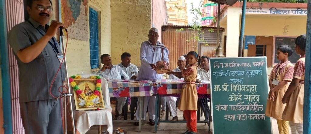 प्रारंभी माजी सरपंच शिवाजीराव भगुरे यांनी संजीवनी उद्योग समुहाचे अध्यक्ष बिपीनदादा कोल्हे यांच्या मोफत वही वाटप अभियानाची माहिती दिली. मुख्याध्यापक श्री. रामदास लांघी म्हणाले की, मोफत वहया वाटपाचे उपक्रम समाजासाठी प्रबोधन करणारे असुन येथुन शिक्षण घेवुन बाहेर पडणा-या विद्यार्थ्यांनी आपले कर्तव्य म्हणून गांव, शाळेसाठी प्रेरणादायी उपक्रम राबवुन या नांवलौकीकात आणखी भर घालावी.