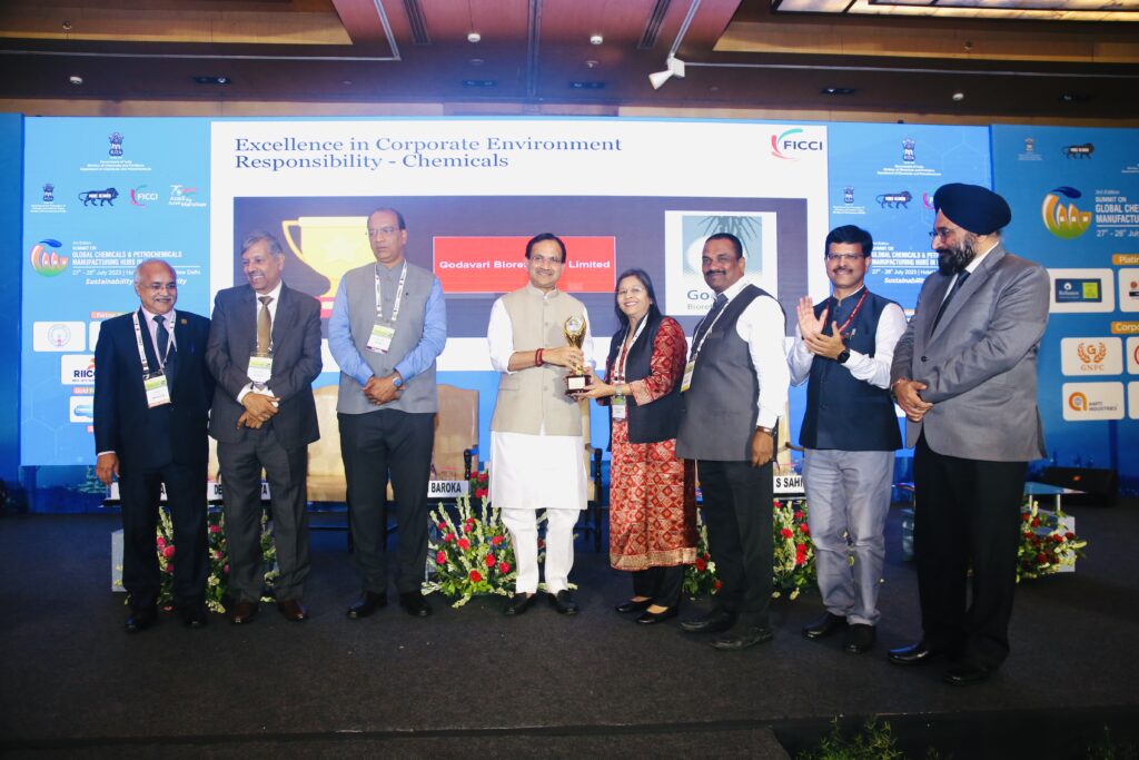 कोपरगाव प्रतिनिधी:- कोपरगाव तालुक्यातील साकरवाडी येथील अग्रगण्य गोदावरी बायोरिफायनरीज लि. या कंपनीला रसायन उद्योगातील पर्यावरणामध्ये विशेष योगदानाबद्दल २०२३ मधील उत्कृष्ट पर्यावरण जबाबदारी हा पुरस्कार प्रदान करण्यात आला आहे. फेडरेशन ऑफ इंडियन चेंबर ऑफ कॉमर्स अँड इंडस्ट्रीज यांच्या वतीने हा पुरस्कार देण्यात आला. दिल्ली येथे गुरुवारी दि. २७ जुलै २०२३ रोजी झालेल्या कार्यक्रमात केंद्रीय रसायन व पेट्रोकेमिकल मंत्री श्री. भगवंत खुबा यांच्या हस्ते कंपनीच्या कार्यकारी संचालीका डॉ. संगीता श्रीवास्तव व साकरवाडी युनिट चे संचालक श्री. सुहास गोडगे यांनी हा पुरस्कार स्वीकारला.