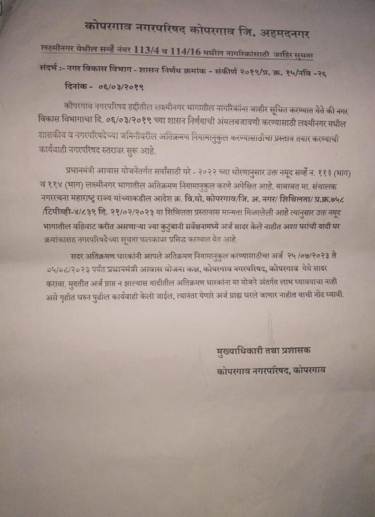 प्रधानमंत्री आवास योजनेंतर्गत सर्वांसाठी घरे २०२२ च्या धोरणानुसार उक्त नमूद सर्व्हे नं. ११३ (भाग) व ११४ (भाग) लक्ष्मीनगर भागातील अतिक्रमण नियामानुकुल करणे अपेक्षित आहे. याबाबत मा. संचालक नगररचना महाराष्ट्र राज्य यांच्याकडील आदेश क्र. वि.यो. कोपरगाव / जि. अ. नगर/ शिथिलता/ प्र.क्र.७५८ /टिपीव्ही-४/८३९ दि. २१/०२/२०२३ या शिथिलता प्रस्तावास मान्यता मिळालेली आहे त्यानुसार उक्त नमूद भागातील वहिवाट करीत असणाऱ्या ज्या कुटुंबानी सर्वेक्षनामध्ये अर्ज सादर केले नाहीत अशा घरांची यादी घर क्रमांकासह नगरपरिषदेच्या सूचना फलकावर प्रसिद्ध करण्यात येत आहे.