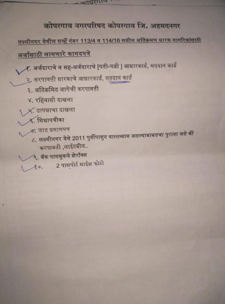 कोपरगाव नगरपरिषद हद्दीतील लक्ष्मीनगर भागातील नागरिकांना जाहीर सूचित करण्यात येते की नगर विकास विभागाचा दि. ०६/०३/२०१९ च्या शासन निर्णयाची अंमलबजावणी करण्यासाठी लक्ष्मीनगर मधील शासकीय व नगरपरिषदेच्या जमिनीवरील अतिक्रमण नियामानुकुल करण्यासाठीचा प्रस्ताव तयार करण्याची कार्यवाही नगरपरिषद स्तरावर सुरू आहे.