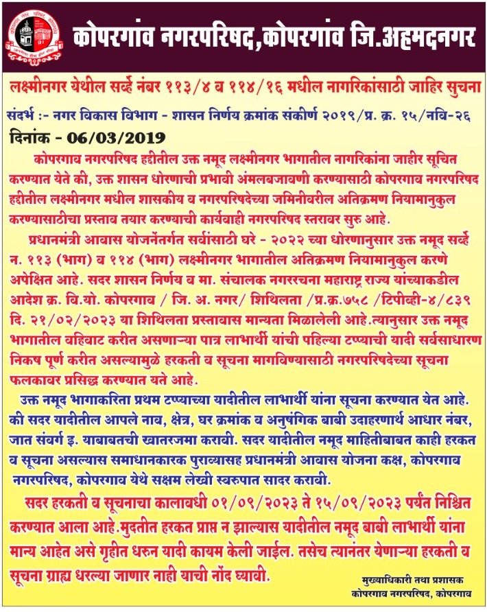 प्रधानमंत्री आवास योजनेंतर्गत सर्वांसाठी घरे २०२२ च्या धोरणानुसार उक्त नमूद सर्व्हे – न. ११३ (भाग) व ११४ (भाग) लक्ष्मीनगर भागातील अतिक्रमण नियामानुकुल करणे अपेक्षित आहे. सदर शासन निर्णय व मा. संचालक नगररचना महाराष्ट्र राज्य यांच्याकडील आदेश क्र. वि.यो. कोपरगाव / जि. अ. नगर / शिथिलता / प्र. क्र. ७५८ / टिपीव्ही- ४ / ८३९ दि. २१/०२/२०२३ या शिथिलता प्रस्तावास मान्यता मिळालेली आहे. त्यानुसार उक्त नमूद भागातील वहिवाट करीत असणाऱ्या पात्र लाभार्थी यांची पहिल्या टप्प्याची यादी सर्वसाधारण निकष पूर्ण करीत असल्यामुळे हरकती व सूचना मागविण्यासाठी नगरपरिषदेच्या सूचना फलकावर प्रसिद्ध करण्यात येते आहे.