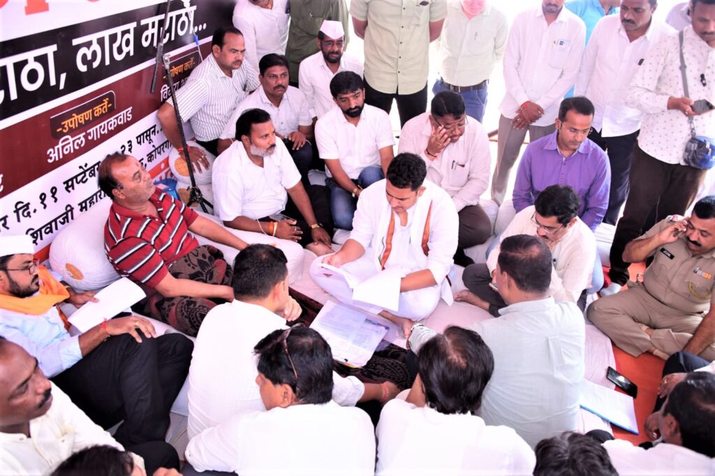 फोटो ओळ:- उपोषणकर्त्या मराठा समाज बांधवांशी चर्चा करतांना आ. आशुतोष काळे.