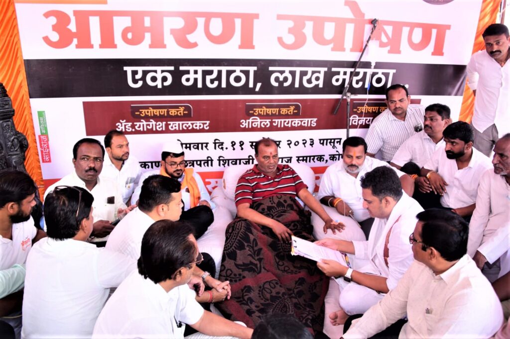 मराठा समाजाला आरक्षण मिळावे यासाठी कोपरगाव तालुका सकल मराठा समाजाच्या वतीने कोपरगाव शहरातील श्री छत्रपती शिवाजी महाराज स्मारक या ठिकाणी अॅड. योगेश खालकर, अनिल गायकवाड, विनय भगत या मराठा समाज बांधवानी आमरण उपोषण सुरु केले असून त्यांच्या समवेत मराठा समाज बांधव देखील साखळी पद्धतीने उपोषण करीत आहे. मराठा समाजाच्या मागण्यांची दखल न घेतल्यास शनिवार (दि.१६) रोजी आत्मदहन करण्याचा ईशारा उपोषणकर्ते अॅड. योगेश खालकर, अनिल गायकवाड, विनय भगत यांनी प्रशासनाला दिला होता. त्याबाबत आ. आशुतोष काळे यांनी उपोषणकर्त्यांची भेट घेवून त्यांच्या आंदोलनाला पाठींबा दिला.मराठा आरक्षणासंदर्भात सरकारकडे पाठपुरावा सुरु आहे. मराठा समाजाच्या आंदोलनाची दखल घ्यावी याबाबत उपमुख्यमंत्री ना. अजितदादा पवार यांची भेट घेवून आंदोलनाकडे सरकारचे लक्ष वेधले आहे. महायुती शासन मराठा समाजाच्या आंदोलनाची गांभिर्याने दखल घेवून त्याबाबत लवकरच सकारात्मक निर्णय होईल. त्यामुळे उपोषणकर्त्यांनी शनिवार रोजी आत्मदहन करण्याचा घेतलेला निर्णय मागे घ्यावा अशी विनंती केली. हि विनंती मान्य करून उपोषणकर्त्यांनी आत्मदहनाचा निर्णय मागे घेतला आहे. उपोषणकर्त्यांची प्रकृती काहीशी खालावली असून डॉक्टरांनी उपोषणकर्त्यांच्या तब्बेतीची योग्य काळजी घ्यावी अशा सूचना आ.आशुतोष काळे यांनी यावेळी वैद्यकीय अधिकाऱ्यांना दिल्या.