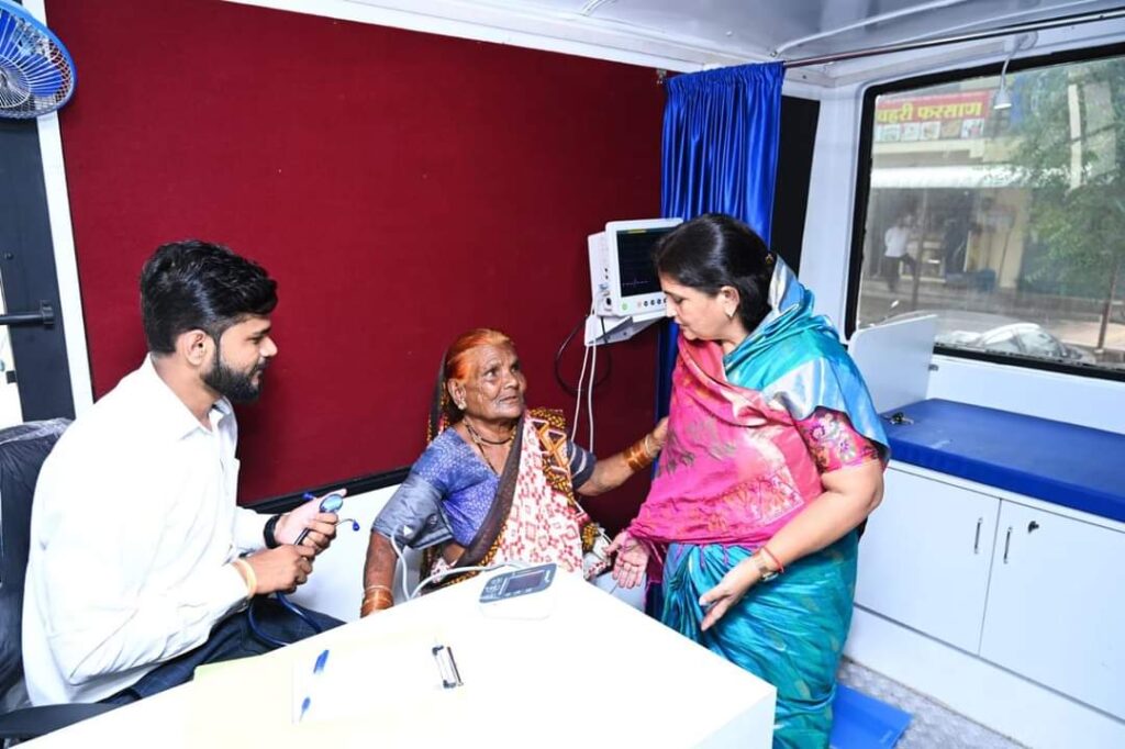ग्रामीण भागातील गोरगरीब नागरिकांना शहरात महागड्या रुग्णालयात जाऊन औषधोपचार घेणे परवडत नाही. त्यामुळे त्यांना दर्जेदार व मोफत वैद्यकीय सेवा उपलब्ध करून देण्यासाठी माजी मंत्री सहकारमहर्षी स्व. शंकरराव कोल्हे यांच्या स्मरणार्थ संजीवनी युवा प्रतिष्ठानच्या वतीने युवा नेते विवेकभैय्या कोल्हे यांच्या संकल्पनेतून ‘मोफत फिरता दवाखाना’ सुरू करण्यात आला आहे. शुक्रवारी (२२ सप्टेंबर) कोपरगाव तालुक्यातील संवत्सर व भोजडे येथे हा ‘मोफत फिरता दवाखाना’ ग्रामस्थांच्या सेवेत उपलब्ध करण्यात आला. माजी आमदार तथा भाजप नेत्या स्नेहलताताई कोल्हे यांनी या मोफत फिरत्या दवाखान्याला भेट देऊन रुग्णांशी व ग्रामस्थांशी संवाद साधला. अनेक रुग्णांनी या फिरत्या दवाखान्याला भेट देऊन मोफत आरोग्य सेवेचा लाभ घेतला.