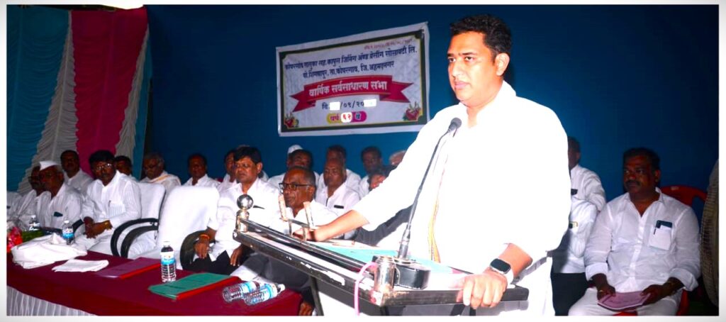 फोटो ओळ – कोपरगाव तालुका सहकारी कापूस जिनिंग अँड प्रेसिंग सोसायटीच्या ६२ व्या वार्षिक सर्वसाधारण सभेत मार्गदर्शन करतांना आ.आशुतोष काळे समवेत संस्थेचे चेअरमन गोरक्षनाथ जामदार व मान्यवर.