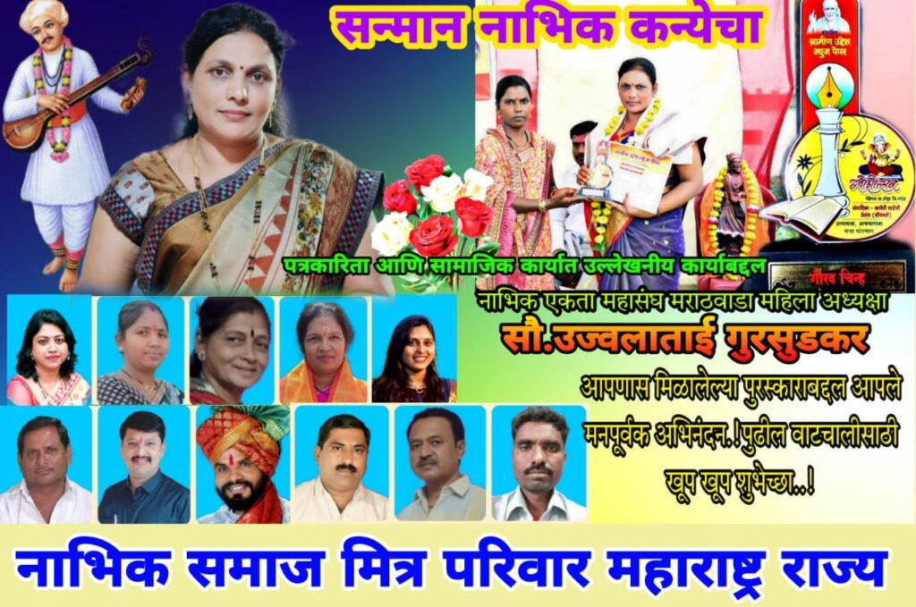 नाभिक एकता महासंघ. मराठवाडा महिला अध्यक्षा सन्माननीय सौ उज्वलाताई गुरसुडकर यांना उत्कृष्ट पत्रकारीता आणि सामाजिक कार्यात उल्लेखनीय कार्य केल्याबद्दल भेंडेगाव येथील ग्रामीण उद्देश न्यूज पेपर श्री गणेश मंडळातर्फे मान्यवराच्या हस्ते सन्मानचिन्ह व प्रशस्तीपत्र देऊन गौरवण्यात आले आहे .नाभिक समाज मित्र परिवाराच्या वतीने त्यांचे अभिनंदन करण्यात आले असुन पुढील वाटचालीस त्यांना शुभेच्छा देण्यात आल्या आहेत