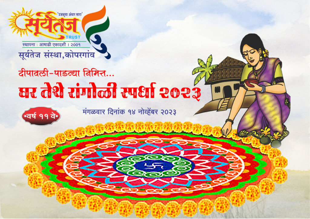 कोपरगाव येथील सूर्यतेज संस्थेच्या वतीने कोपरगाव फेस्टिव्हल अंतर्गत अ.भा.मराठी नाट्य परिषद अहमदनगर जिल्हा शाखा,बाल रंगभूमी परिषद,अहमदनगर,फोटोग्राफर असोसिएशन,कलाध्यापक संघ यांचे सहभागातून आणि विसपुते सराफ, धन्वंतरी आयुर्वेद पंचकर्म,कापसे पैठणी, पुष्पांजली शाॅपी, अग्रवाल चहा, पांडे स्विटस्, सुशांत आर्टस् ॲन्ड पब्लिसिटी यांचे सहकार्याने सालाबादप्रमाणे परंपरेनुसार याही वर्षी दीपावली-पाडवा निमित्त 'घर तेथे रांगोळी' स्पर्धेचे आयोजन सहभागी स्पर्धकांच्या घरासमोरील अंगणात मंगळवार दि.१४ नोव्हेंबर २०२३ रोजी सूर्योदयापासून ते सकाळी ९.३० पर्यंत आयोजित केल्याची माहिती सूर्यतेज संस्थापक व स्वच्छतादूत सुशांत घोडके यांनी दिली आहे.
