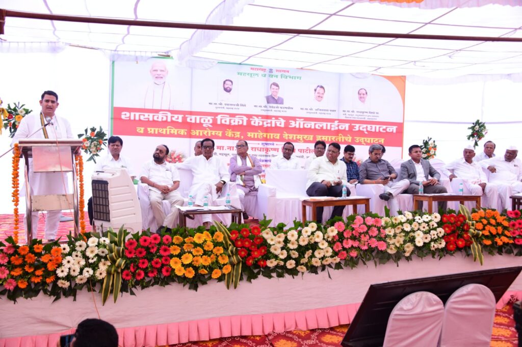 फोटो ओळ – माहेगाव देशमुख प्राथमिक आरोग्य केंद्राच्या इमारतीचे उद्घघाटन व जिल्ह्यातील शासकीय वाळू विक्री केंद्राचे (ऑनलाईन पद्धतीने) उदघाटन प्रसंगी मार्गदर्शन करतांना महसूल, पशु संवर्धन, दुग्ध विकास मंत्री तथा अहमदनगर जिल्ह्याचे पालकमंत्री ना. राधाकृष्ण विखे पाटील.