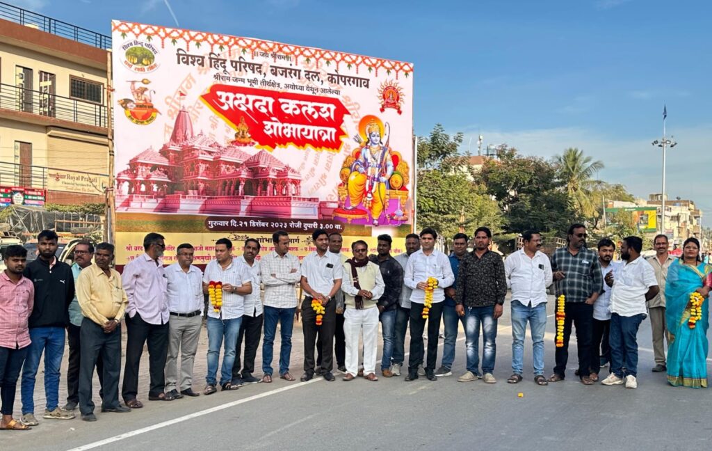 श्री क्षेत्र अयोध्या येथे २२ जानेवारी रोजी भव्य मंदिरात श्रीरामलल्लाच्या शिल्पाची स्थापना होणार असून या भव्यदिव्य सोहळ्याच्या निमित्ताने अयोध्या येथून श्रीराम जन्मभूमी न्यासातर्फे संपूर्ण देशात अभिमंत्रित केलेला ‘अक्षदा कलश’ पाठविण्यात आला असून या ‘अक्षदा कलशाचे’ कोपरगाव शहरात आगमन होताच आ. आशुतोष काळे यांच्या वतीने राष्ट्रवादी काँग्रेस पक्षाच्या कार्यकर्त्यांनी जय श्रीरामाचा जयघोष करत ‘अक्षदा कलशाचे’विधिवत पूजन करून मनोभावे दर्शन घेतले. या ‘अक्षदा कलशाचे’ दर्शन घेण्यासाठी कोपरगाव शहरातील चौकाचौकात नागरिकांनी मोठी गर्दी केली होती.