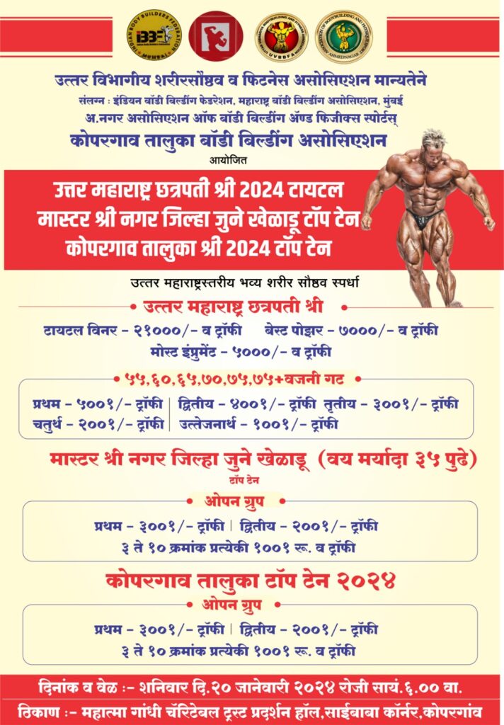 उत्तर विभागीय शरीरसौष्ठव व फिटनेस असोसिएशन मान्यतेने संलग्न : इंडियन बॉडी बिल्डींग फेडरेशन, महाराष्ट्र बॉडी बिल्डींग असोसिएशन, मुंबई अ.नगर असोसिएशन ऑफ बॉडी बिल्डींग अॅण्ड फिजीक्स स्पोर्टस् कोपरगाव तालुका बॉडी बिल्डींग असोसिएशन आयोजित उत्तर महाराष्ट्र छत्रपती श्री 2024 टायटल मास्टर श्री नगर जिल्हा जुने खेळाडू टॉप टेन कोपरगाव तालुका श्री 2024 टॉप टेन आणि उत्तर महाराष्ट्रस्तरीय भव्य शरीर सौष्ठव स्पर्धा कोपरगाव शहरात होत आहे यासंदर्भात येथे दि.2 जानेवारी 24 रोजी बाबा फिटनेस कोपरगाव या ठिकाणी कोपरगाव तालुका बॉडी बिल्डिंग असोसिएशन यांची बैठक झाली. या वेळी २० जानेवारी २०२४ रोजी शारीरसवष्टव स्पर्धाचे आयोजन करण्यात आले आहे . अशी माहिती कोपरगाव तालुका बॉडी बिल्डिंगचे अध्यक्ष शरद खरात यांनी दिली. यावेळी प्रतीक पाटील जिल्हा खजिनदार व राज्यस्तरीय पंच राहुल कुलकर्णी जिल्हा सहखजिनदार व जिल्हास्तरीय पंचअमीन सय्यद,डॉक्टर दीपक पगारे,अभय हलवाई,बाबासाहेब घेर,राहुल पहिलवान, भीमा चव्हाण, दीपक पगारे, विदीत जोशी, श्रीकांत जाधव, रवींद्र सूर्यवंशी, नवनाथ कुरे,आकाश भोसले, इत्यादी जिम ओनर व ट्रेनर उपस्थित होते .हि स्पर्धा :- शनिवार दि. २० जानेवारी २०२४ रोजी सायं. ६.०० वा. :- महात्मा गांधी चॅरिटेबल ट्रस्ट प्रदर्शन हॉल, साईबाबा कॉर्नर, कोपरगांव येथे होणार आहे.