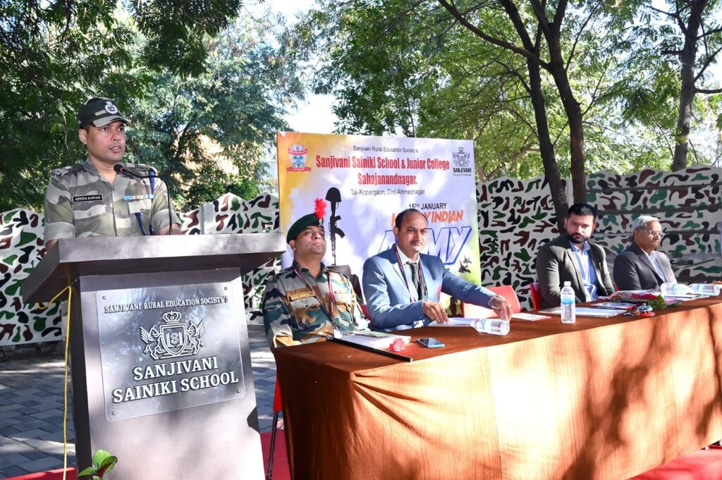 संजीवनी सैनिकी स्कूलमध्ये भारतीय सैन्य दिवस साजरा…कोपरगांव प्रतिनिधी:- भारत देश सुमारे १५० वर्षे ब्रिटिशांच्या जोखडात होता. १५ ऑगस्ट, १९४७ रोजी देशाला स्वातंत्र्य मिळाल्यानंतरही लष्कर प्रमुख ब्रिटिश वंशाचे होते. तथापि, १९४९ मध्ये शेवटचे ब्रिटिश कमांडर इन चीफ जनरल फ्रान्सिस बुचर गेल्यानंतर, त्यांची जागा एका भारतीयाने घेतली. फील्ड मार्शल के. एम. करिअप्पा हे स्वतंत्र भारताचे पहिले लष्कर प्रमुख बनले. त्यांनी १५ जानेवारीलाच पदभार स्वीकारला. देशाच्या लष्कराचे नेतृत्व एका भारतीयाच्या हाती आलेला हा दिवस इतिहासात खुप महत्वाचा होता. म्हणुनच हा दिवस भारतीय सैन्य दिवस म्हणुन संपुर्ण भारतभर साजरा करण्यात येतो, असे प्रतिपादन सीआयएसएफचे डेप्युटी कमांडंट श्री अमित कुमार यांनी केले.संजीवनी सैनिकी स्कूल अँड ड ज्युनिअर कॉलेज मध्ये आज ‘भारतीय सैन्य दिवस’ मोठ्या उत्साहात साजरा करण्यात आला. या कार्यक्रमाचे प्रमुख पाहुणे म्हणुन श्री अमित कुमार बोलत होते. संजीवनी ग्रुप ऑफ इन्स्टिट्यूट्सचे विश्वस्त श्री सुमित कोल्हे यांनी या कार्यक्रमाचे अध्यक्षस्थान भुषविले. यावेळी व्यासपीठावर डायरेक्टर (नॉन अकॅडमिक) श्री ज्ञानदेव सांगळे, प्राचार्य कैलास दरेकर, वसतिगृह अधिक्षक श्री विजय भास्कर उपस्थित होते.सर्व प्रथम शहिद स्मारकाला पुष्पचक्र अर्पण करून अभिवादन करण्यात आले, तसेच स्व.शंकरराव कोल्हे यांच्या प्रतिमेचेही पुजन करून अभिवादन करण्यात आले. यावेळी सैनिकी प्रशिक्षण देणाऱ्या सर्व माजी सैनिकांचा सत्कार करण्यात आला.श्री अमित कुमार यांनी विध्यार्थ्यांना सांगीतले की ज्या क्षेत्रात कार्य कराल तेथे शाळेचा नावलौकिक होईल असे वर्तन करा. आपण ज्यांना आदर्श मानतो, त्यांचे चरित्र डोळ्यासमोर ठेवुन वाटचाल करा. स्वतःचे अनुभव कथन करताना त्यांनी सांगीतले की सात वेळा आतंकवादी हल्ले परतुन लावण्यात यश आले. हे समन्वयाने शक्य झाले. तसेच तुम्हीही योग्य समन्वय जीवनात साधा. विध्यार्थ्यांनी बॅण्डच्या तालावर केलेल्या शिस्ततबध्द संचलनाचे कौतुकही त्यांनी केले. अध्यक्ष स्थानावरून बोेलताना श्री सुमित कोल्हे यांनी स्व. कोल्हे यांचे संकल्पनेतुन स्थापन झालेल्या प्रि कॅडेट सेंटरच्या माध्यमातुन अनेक जवान देशाच्या संरक्षणासाठी दिल्याचे सांगीतले. तसेच सैनिकी शाळेतुन सैन्य दलात झालेल्या माजी विध्यार्थ्यांचीही माहिती दिली. यावेळी ते म्हणाले की सैनिकांचे अनुभव ऐकायला छान वाटतात, परंतु काश्मीर सारख्या ठिकाणी बर्फात काम करणे किती अवघड असते, याची कल्पना आपण करू शकत नाही.श्री संतोश सुर्यवशी यांनी सुत्रसंचालन केले तर प्राचार्य दरेकर यांनी आभार मानले.