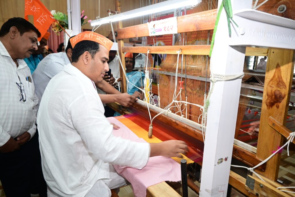 फोटो ओळ – प्रभू श्रीराम मूर्ती प्राणप्रतिष्ठा सोहळ्यासाठी रामलल्लाच्या महावस्त्राचा धागा विणण्याची सेवा करतांना आ. आशुतोष काळे.