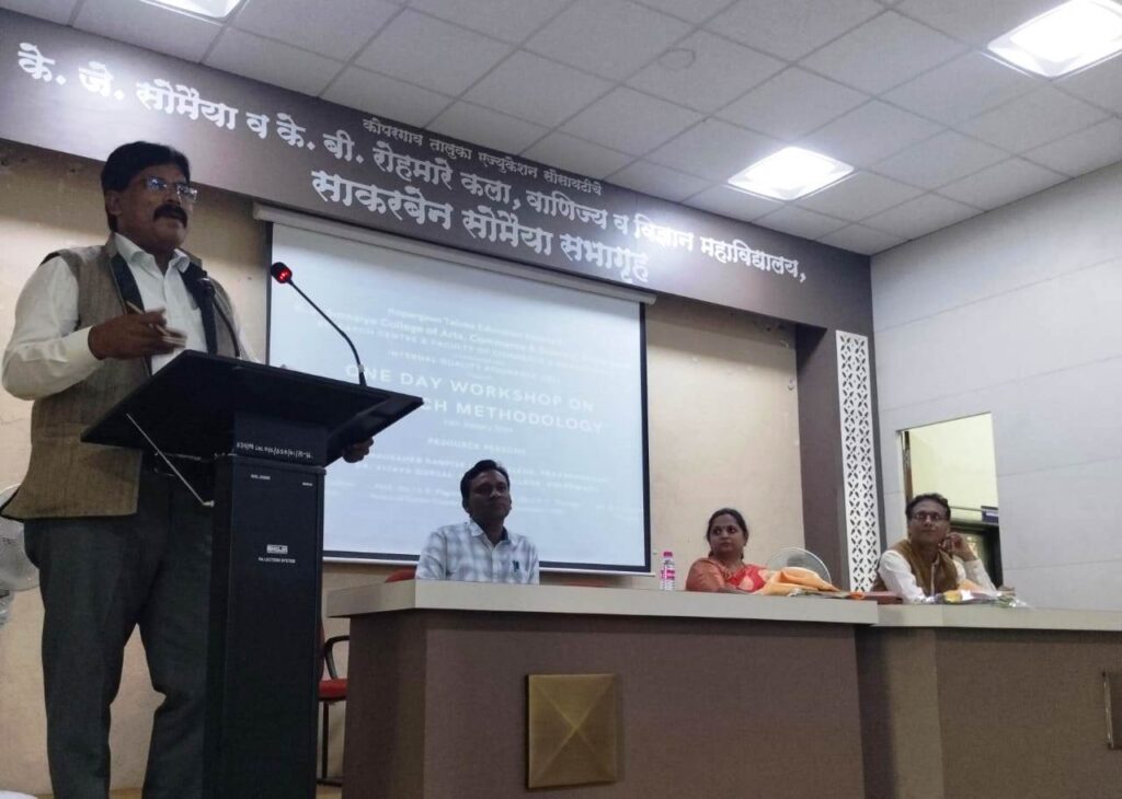कोपरगाव प्रतिनिधी:- कोपरगांव तालुका एज्युकेशन सोसायटी संचलित के.जे. सोमैया (वरिष्ठ) व के.बी.रोहमारे (कनिष्ठ) महाविद्यालयात वाणिज्य विभाग व अंतर्गत गुणवत्ता हमी कक्षाच्या संयुक्त विद्यमाने संशोधन पद्धती या विषयावर एकदिवशीय कार्यशाळा आयोजित करण्यात आली अशी माहिती महाविद्यालयाचे प्राचार्य डॉ.बी.एस.यादव व वाणिज्य संशोधन केंद्राचे समन्वयक प्रो. संतोष पगारे यांनी दिली. या कार्यशाळेचे उद्घाटन पी.व्ही.पी. महाविद्यालयाचे डॉ. भाऊसाहेब रणपिसे, सौ.सुशिलामाई काळे महाविद्यालयाच्या प्राचार्या डॉ. विजया गुरसळ, अंतर्गत गुणवत्ता हमी कक्षाचे समन्वयक प्रो. विजय ठाणगे यांच्या हस्ते संपन्न झाले. कार्यशाळेच्या पहिल्या सत्रात सौ.सुशिलामाई काळे महाविद्यालयाच्या प्राचार्या डॉ. विजया गुरसळ यांनी ‘संशोधन कार्यातील कागदपत्रांचे व्यवस्थापन आणि संशोधन कार्यपद्धती’ या विषयावर उपस्थित विद्यार्थांना मार्गदर्शन करतांना संशोधक विद्यार्थ्यांनी जिद्दीने संशोधन केले पाहिजे असे प्रतिपादन केले. दुसऱ्या सत्रात डॉ. भाऊसाहेब रणपिसे यांनी ‘संशोधन माहिती संकलन’ या विषयावर बोलतांना संशोधन करतांना माहिती संकलनाचे विविध टप्पे व कार्यपद्धती यावर सखोल मार्गदर्शन केले. यावेळी त्यांनी सामाजिक संशोधन हे काळाची गरज असून संशोधक विद्यार्थ्यांनी गुणवत्ता पूर्वक संशोधन केले पाहिजे असे प्रतिपादन केले. डॉ. रवींद्र जाधव यांनी ‘एम.एस.ऑफिसच्या साहाय्याने केले जाणारे संदर्भ व्यवस्थापन व प्रबंध-लेखन’ या विषयावर मार्गदर्शन केले.