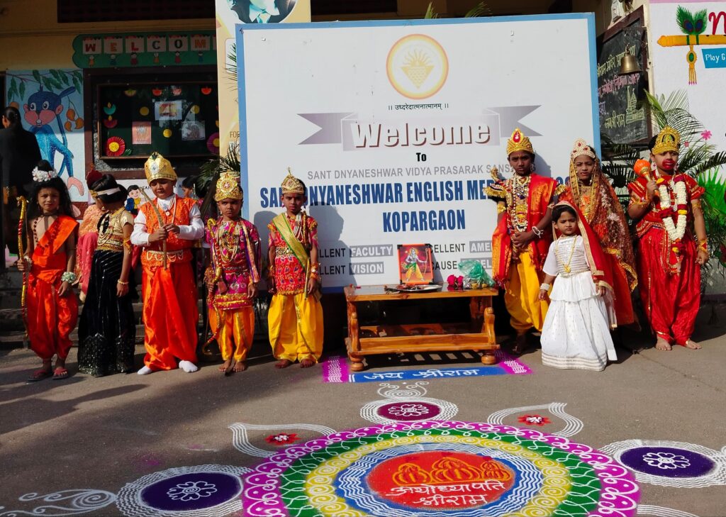 राम मंदिर प्राणप्रतिष्ठा सोहळा येत्या २२ जानेवारी रोजी उत्साहात पार पडत असून शाळा व कॉलेजला देखील सुट्टी जाहिर करण्यात आली आहे. याच उत्सवाचे औचित्य साधून संत ज्ञानेश्वर इंग्लिश मिडीअम मध्ये विद्यार्थ्यांनी प्रभू श्रीराम,माता सीता व हनुमाची आकर्षक वेशभूषा करून प्रभू श्रीरामाचा जय घोष केला. तसेच प्रभु रामाच्या प्रतिमेस पुष्पहार अर्पण करून शिक्षकांनी सर्व विद्यार्थ्यांना राम मंदिरा विषयी माहिती दिली व रामरक्षा स्तोत्राचे पठन केले. शाळेत आकर्षक रांगोळ्या,विद्युत रोशनाई,भगवे ध्वज व दिव्यांची सजावट करण्यात आली होती. सर्व विद्यार्ध्यांना प्रसादाचे वाटप करण्यात आले व प्रभू श्रीरामाच्या गाण्यांच्या तालावर सर्व विद्यार्थी व शिक्षकांनी ठेका धरत जल्लोष केला. या वेळी विद्यार्थी,पालक,शिक्षक व शिक्षकेतर कर्मचारी उपस्थित होते.
