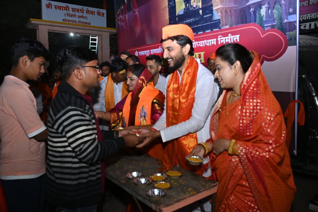 संपूर्ण जगाचे लक्ष लागलेल्या श्रीराम जन्मभूमी अयोध्येतील भव्य श्रीराम मंदिराचे उद्घाटन व श्रीरामलल्ला मूर्ती प्रतिष्ठापना सोहळा सोमवारी (२२ जानेवारी) पंतप्रधान नरेंद्र मोदी यांच्या हस्ते मोठ्या उत्साहात पार पडला. या प्राणप्रतिष्ठा सोहळ्यानिमित्त सोमवारी कोपरगावात संजीवनी युवा प्रतिष्ठानच्या वतीने प्रभू श्रीरामाला वंदन करून आनंदोत्सव साजरा करण्यात आला. यानिमित्ताने सायंकाळी झालेल्या गंगा गोदावरी महाआरतीप्रसंगी संजीवनी युवा प्रतिष्ठानच्या वतीने सर्व भाविकांना स्नेहलताताई कोल्हे, विवेकभैय्या कोल्हे, रेणुकाताई कोल्हे यांच्या हस्ते बुंदी प्रसाद वाटप करण्यात आला. अनेक भाविकांनी या प्रसादाचा लाभ घेतला. हा प्रसाद तयार करण्यासाठी युवा नेते विवेकभैय्या कोल्हे यांनी स्वत: आपली सेवा दिली. त्यांनी स्वत:च्या हाताने बुंदी पाडली आणि प्रसाद तयार करण्यासाठी युवा सेवकांना मदत केली.