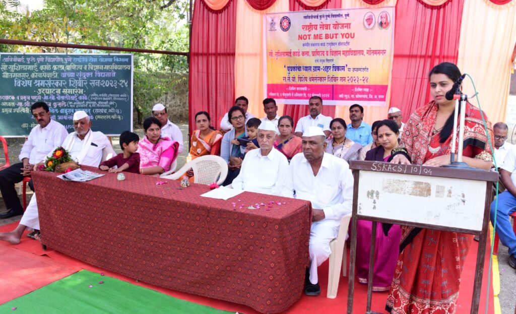 याप्रसंगी उपस्थित विद्यार्थ्यांना मार्गदर्शन करतांना त्या म्हणाल्या की, राष्ट्रीय सेवा योजना शिबिराच्या माध्यमातून विद्यार्थ्यांचा व्यक्तिमत्व विकास होवून विद्यार्थ्यांमध्ये नियोजनात्मक कला विकसित होते. निवासी शिबिरातून सेवा आणि त्याग हे शब्द युवकांच्या आयुष्यातील सेवेचे महत्त्व विशद करतात. त्यांना समाजासोबत मिळून मिसळून राहायची व श्रम संस्कारातून समाजाशी एकरूप होण्याची शिकवण मिळते व या समाजसेवेच्या माध्यमातुन विद्यार्थ्यांच्या व्यक्तिमत्वाचा खऱ्या अर्थाने सर्वांगीण विकास होत असल्याचे त्यांनी सांगितले.