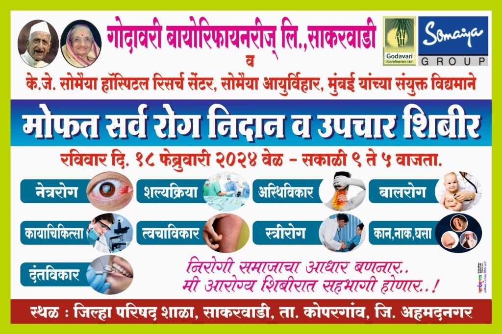 कोपरगाव प्रतिनिधी:- गोदावरी बायोरिफायनरीज लि. साकरवाडी व के.जे. सोमैया मेडिकल कॉलेज आणि रिसर्च सेंटर, सोमैया आयुर्विहार मुंबई यांच्या संयुक्त विद्यमाने जिल्हा परिषद प्राथमिक शाळा साकरवाडी येथे रविवारी (ता. १८) सर्वरोग निदान शिबिर आयोजित करण्यात आले आहे. सकाळी ९ ते सायंकाळी ४ या वेळेत हे शिबिर होईल. गोदावरी बायोरिफायनरीज लि. साकरवाडी चे डायरेक्टर श्री. सुहास गोडगे यांच्या हस्ते शिबिराचे उद्घाटन होईल. मधुमेह, रक्तदाब, कॅन्सर, क्षयरोग आदी आजारांबाबत निदान व उपचार केले जाणार आहेत. स्त्रीरोग तज्ज्ञ, बालरोग तज्ज्ञ, जनरल सर्जन, कान-नाक-घसा तज्ज्ञ, नेत्ररोग चिकित्सा आदींबाबत निदान व उपचार केले जाणार आहेत. या शिबिरामध्ये मुंबई येथील तज्ञ डॉक्टरांकडून तपासणी करण्यात येणार आहे. शिबिराला उपस्थित राहणाऱ्यांनी आधार कार्ड सोबत आणणे अनिवार्य आहे. या शिबिराचा जास्तीत जास्त गरजूंनी लाभ घ्यावा असे आवाहन गोदावरी बायोरिफायनरीज लि. साकरवाडी चे जनरल मनेजर श्री. प्रवीण विभूते तसेच के.जे. सोमैया मेडिकल कॉलेज आणि रिसर्च सेंटर, सोमैया आयुर्विहार मुंबई च्या वैद्यकीय अधीक्षक डॉ. मिनू यांनी केले आहे.