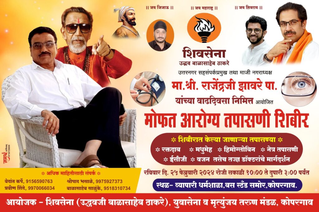 शिवसेना उद्धव बाळासाहेब ठाकरे गटाचे उत्तरनगर सह संपर्कप्रमुख व माजी नगराध्यक्ष मा.श्री.राजेंद्रजी झावरे यांच्या वाढदिवसा निमित्त कोपरगाव शिवसेना,युवासेना,शिव आरोग्य सेना,सर्व शिवसेनेचे अंगीकृत संघटना व मृत्युंजय तरुण मंडळ यांच्यामार्फत मोफत आरोग्य तपासणी शिबिर कोपरगावकरांसाठी रविवार दिनांक २५ फेब्रुवारी,२०२४ रोजी व्यापारी धर्मशाळा कोपरगाव येथे आयोजित करण्यात आले आहे. या शिबिरामध्ये नेत्र तपासणी, हिमोग्लोबिन,मधुमेह,ई.सी.जी,रक्तदाब,वजन व तसेच तज्ञ डॉक्टरांचा सल्ला व मार्गदर्शन करण्यात येणार आहे. तरी कोपरगावातील जास्तीत जास्त नागरिकांनी या मोफत आरोग्य तपासणीचा लाभ घ्यावा असे आवाहन कोपरगाव युवासेनेचे शहर प्रमुख शेखर कोलते यांनी केले आहे.