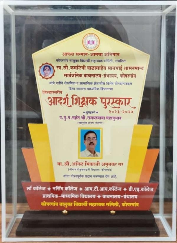 कोपरगांव येथील श्रीमान गोकुळचंदजी विदयालयातील श्री.अनिल भिकाजी अमृतकर यांना स्व.सौ.कमलिनी सातभाई शासन मान्य सार्वजनिक वाचनालय- ग्रंथालयाच्या वतीने शैक्षणिक क्षेत्रातील योगदाना बद्दल दिला जाणारा जिल्हास्तरीय आदर्श शिक्षक पुरस्कार नुकताच प्रदान करण्यात आला.