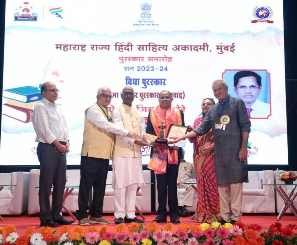 फोटोओळ :- महाराष्ट्र राज्य हिंदी साहित्य अकादमीचे कार्याध्यक्ष डॉ. शितलाप्रसाद दुबे व इतर मान्यवरांच्या हस्ते पुरस्कार स्वीकारताना प्रो. जिभाऊ मोरे