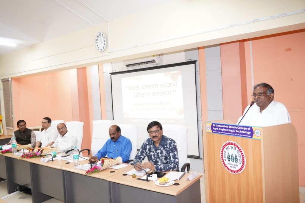 महात्मा फुले कृषि विद्यापीठ, राहुरी येथील अन्नशास्त्र व तंत्रज्ञान विभागाच्या वतीने दि. 18 ते 22 मार्च, 2024 या कालावधीत बेकरी व्यवसाय तंत्रज्ञान प्रशिक्षणाचे आयोजन करण्यात आले आहे. या प्रशिक्षण कार्यक्रमाच्या उद्घाटनप्रसंगी अध्यक्षस्थानावरुन डॉ. सुनील गोरंटीवार बोलत होते. यावेळी अधिष्ठाता डॉ. श्रीमंत रणपिसे, विस्तार शिक्षण संचालक डॉ. सी.एस. पाटील, कृषि अभियांत्रिकी महाविद्यालयाचे सहयोगी अधिष्ठाता डॉ. दिलीप पवार, कृषिविद्या विभाग प्रमुख डॉ. आनंद सोळंके, अन्नशास्त्र व तंत्रज्ञान विभाग प्रमुख तथा या प्रशिक्षणाचे आयोजक डॉ. विक्रम कड, प्रसारण केंद्र प्रमुख डॉ. पंडित खर्डे व डॉ. बाबासाहेब भिटे उपस्थित होते.