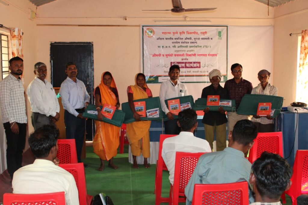 महात्मा फुले कृषि विद्यापीठ, राहुरी अंतर्गत अखिल भारतीय समन्वित औषधी सुगंधी वनस्पती व पानवेल संशोधन प्रकल्प, वनस्पती रोगशास्त्र व कृषि अणुजीवशास्त्र विभाग व भारतीय कृषि अनुसंधान परिषद, नवी दिल्ली यांच्या संयुक्त विद्यमाने आदिवासी उपयोजना (टीएसपी) अंतर्गत एक दिवसीय प्रशिक्षण वर्ग मु.पो. रावलापाणी, ता.तळोदा, जि. नंदुरबार येथे संपन्न झाले. या प्रशिक्षण वर्गामध्ये प्रकल्पाचे प्रभारी अधिकारी डॉ.संजय गावडे यांनी औषधी व सुगंधी वनस्पतीचे महत्व व लागवड तंत्रज्ञान या विषयी सखोल मार्गदर्शन केले व औषधी व सुगंधी वनस्पतींची लागवड ही काळाची गरज असल्याचे प्रतिपादन त्यांनी आपल्या मार्गदर्शनात केले. यावेळी औषधी सुगंधी वनस्पतींची उपलब्ध बाजारपेठ, प्रक्रिया उद्योग, देशांतर्गत व परदेशातील मागणी व उत्पादन याबाबत माहिती शेतकर्यांना देण्यात आली. या एक दिवसीय प्रशिक्षण कार्यक्रमास विशेष उपस्थितांमध्ये नंदुरबार कृषि विज्ञान केंद्राचे वरिष्ठ शास्त्रज्ञ तथा प्रमुख डॉ. राजेंद्र दहातोंडे, डॉ. भावसार व प्रकल्पाचे श्री. ऋषिकेश बरे उपस्थित होते. या कार्यक्रमाच्या शेवटी या प्रकल्पाचे प्रा. भारत पवार यांनी सर्वांचे आभार मानले. या कार्यक्रमासाठी नंदुरबार जिल्ह्यातील मु.पो. रावलापाणी, ता.तळोदा या गावातील आदिवासी वर्गातील शेतकरी बांधव उपस्थित होते.