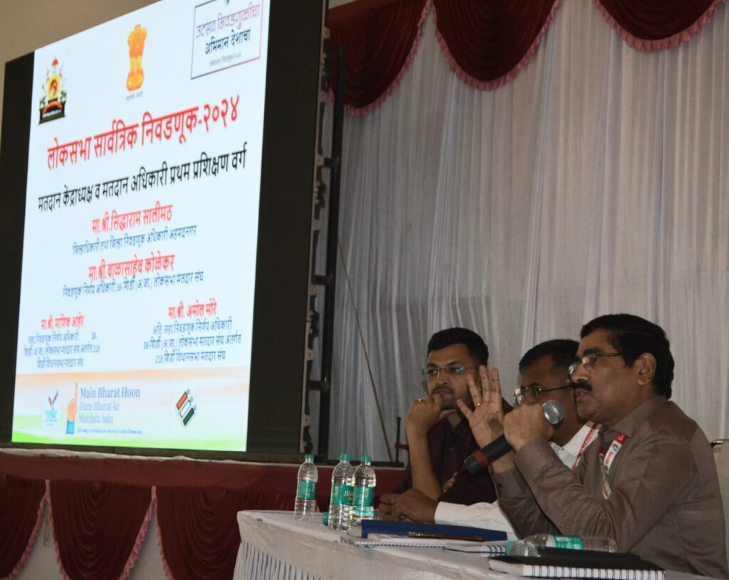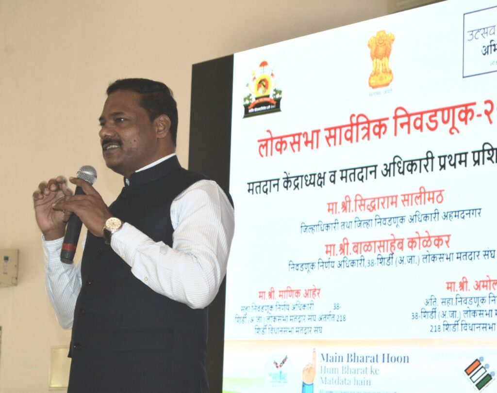 शिर्डी विधानसभा मतदार संघाच्या वतीने राहाता येथील कुंदन लॉन्स येथे आयोजित निवडणूक कर्मचाऱ्यांच्या पहिल्या प्रशिक्षण सत्राच्या प्रथम सत्राच्या भेटीप्रसंगी ते बोलत होते. यावेळी सहायक निवडणूक निर्णय अधिकारी तथा शिर्डी प्रांताधिकारी माणिक आहेर, अतिरिक्त सहायक निवडणूक निर्णय अधिकारी तथा राहाता तहसीलदार अमोल मोरे, गटविकास अधिकारी जालिंदर पठारे, शिर्डी नगरपालिकेचे मुख्याधिकारी सतीश दिघे आदी उपस्थित होते.