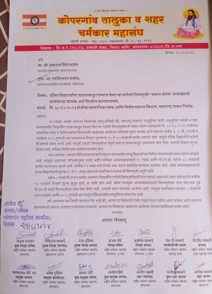 कोपरगाव प्रतिनिधी:- महाराष्ट्रातील मागासवर्गीय विद्यार्थ्यांना परदेशातील शिक्षणासाठी देण्यात येणाऱ्या शिष्यवृत्ती बाबत ‘समान धोरण’ नावाखाली महाराष्ट्र सरकारने नविन आदेश काढल्याने मागासवर्गीय मुलांचे परदेशातील शिक्षणाचे द्वार बंद केले असुन सर्व सामान्य मागासवर्गीय विद्यार्थ्यांच्या भवितव्यावर ‘खोडा’ घालणारा शासन निर्णय तात्काळ रद्द करावा या मागणीचे निवेदन जिल्हाधिकारी मार्फत मुख्यमंत्री एकनाथराव शिंदे यांना राष्ट्रीय चर्मकार महासंघाचे राष्ट्रीय अध्यक्ष,माजी समाजकल्याण मंत्री बबनरावजी घोलप यांच्या आदेशा नुसार तहसीलदार कार्यालय कोपरगाव येथे देण्यात आले.